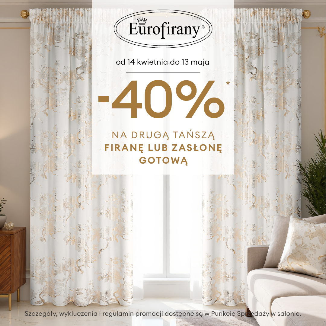 Od 14.04 do 13.05 przy zakupach dwóch firan lub zasłon gotowych -40% rabatu na drugi, tańszy produkt. To idealny moment, by wprowadzić wiosnę do swojego wnętrza.